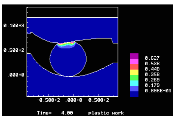 A 2D modelling of a forging production technique for turbine bucket (1994). The constitutive equations for elastic-visco-plastic media and arbitrary moving grid are in use. Contact interaction between rigid walls of the punch and the deformable body is calculated by using the penalty technique and quasi-second order implicit finite element scheme. Convective terms are discretized explicitly using upwind approximations.. This problem is solved primarily by A.Samuelsson and M. Soltani in 1994 using code "DYNA" and remeshing. Calculation is made in a frame of grant from Swedish Royal Academy of Sci. (Code ASTRA 1993-1995)